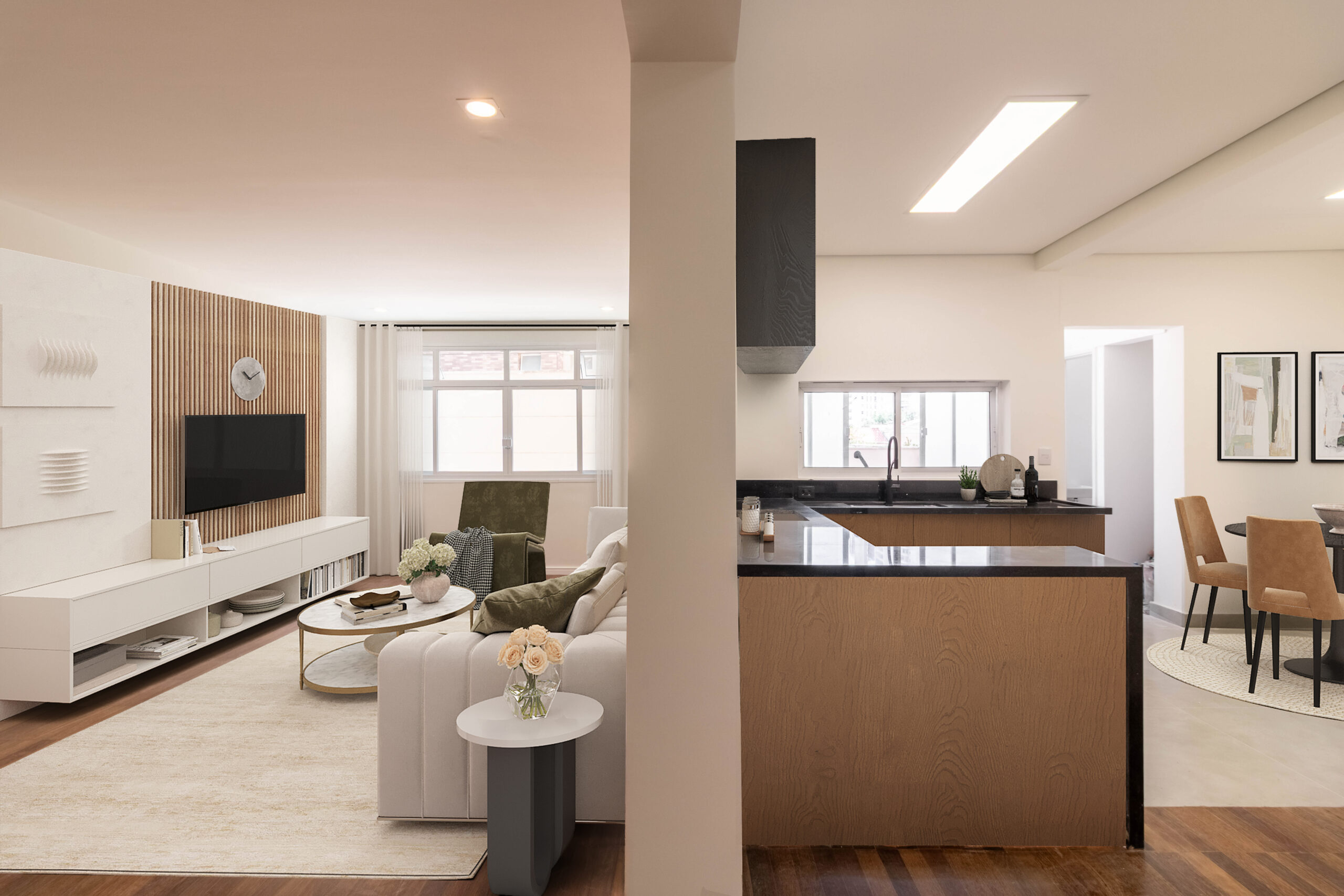 As intervenções partem de uma leitura cuidadosa da planta original, permitindo que salas antes compartimentadas se integrem com naturalidade e que cozinhas se abram para a área social, criando ambientes mais fluidos. Surgem closets e suítes ampliados e espaços dedicados ao trabalho remoto, incorporando novas funções sem comprometer a lógica construtiva do edifício.
